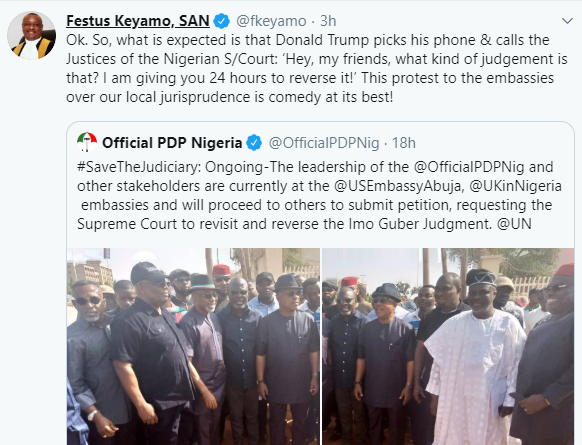 The People's Democratic Party (PDP) has written a petition to the United Kingdom, United States and the European Union after its chairman, Uche Secondus led a protest to the US embassy and the UK high commission in Abuja on Friday January 31, over Emeka Ihedioha's loss at the Supreme Court to Hope Uzodinma of the All Progressives Congress. Senate Minority Leader, Enyinnaya Abaribe; former President of the Senate, Adolphus Wabara; former Imo State governor, Chief Achike Udenwa, as well as members of the National Working Committee (NWC) participated in the protest against the judgement of the apex court which sacked the Emeka Ihedioha as governor of Imo State. In its petition titled ‘Perversion of Justice: Deliberate Efforts At Truncating Democracy in Nigeria,’ the PDP alleged that Nigeria's democracy is in danger as the judiciary has been compromised by the All Progressives Congress (APC) to pervert justice in its favour. The PDP who called for a review of the court judgement, accused the Supreme Court of declaring additional votes (beyond the official number of accredited voters) from 388 polling units which was not certified by the Independent National Electoral Commission (INEC). The petition reads in part; “You may recall that our party, the PDP, the leading opposition party in Nigeria, has been raising issues regarding the continuous interference and arm-twisting of the judiciary by the executive arm and the ruling All Progressives Congress (APC) to influence the outcome of election petitions in various courts, annul elections won by our party and transfer victory to the APC.“Your Excellency, it may have come to your notice that there have been serious protests in various states of our nation threatening the stability of our nation over a recent judgment of the Supreme Court.“It is instructive to inform you that this perversion of justice has already sparked off protests in various parts of our country and has become a clear threat to peace, unity and stability of our nation and the survival of our democracy.“We rejected the judgment with clear call for a judicial review and ultimate reversal of the judgment by the Supreme Court.“Nigerians had been at a shock over the voiding of the lawful election of Ihedioha, who scored 276,404 votes and awarding fictitious votes to declare Hope Uzodimma of the APC, who scored 96, 458 votes as governor of Imo State that the Supreme Court voided. "The Supreme Court declared additional votes (beyond the official number of accredited voters) from 388 polling units, not certified by the Independent National Electoral Commission (INEC) and donated same to the APC and its candidate to declare them winners. It added that the action of the Justice Tanko-led Supreme Court raises very serious issues about miscarriage of justice against the party and democratic order."The same Supreme Court in the most celebrated case of Atiku V Buhari & Ors, decided that for a petitioner to succeed in an allegation of infraction of any provision of the Electoral Act especially one complaining about malpractice, such as wrongful exclusion of votes, the petitioner must call witnesses polling unit by polling unit.“However in this case, the same Supreme Court was not presented any witness from Uzodinma/APC from the fictitious 388 polling units from where the court allocated votes to him. Does the Supreme Court have powers to formulate and allocate votes as election results?“The so-called results from the 388 polling units were rightfully rejected, in line with several decisions of the Supreme Court, by the tribunal and Court of Appeal as it was merely dumped on the tribunal in a bag, by a policeman who had no mandate of the police to testify at the tribunal.“The tribunal did not even open the bag as there was no basis to do so. It is one of the great wonders of the world how the Supreme Court opened the bag, counted the results and added them to only the APC candidate.“What is more perplexing is the fact that INEC produced a schedule of reasons why results were not produced from the 388 units.“Indeed, election did not even take place in most of the units for one reason or another, like violence among others and so no result could possibly be obtained from those units. The results were not merely rejected or cancelled by INEC.“Moreover, your Excellency, nobody is aware of the number of votes scored by each party from the said 388 polling units. The tribunal or Court of Appeal did not mention or ascribe any figure from the units to any party in their decisions.“In fact, during the cross examination of the APC candidate, Senator Hope Uzodinma, he could not read any figure from the said results. He said that the figures were not clear. lt therefore beats the imagination where the Supreme Court conjured and manufactured the figures it used in declaring Uzodinma/ APC as duly elected?” the party stated.“It drew the countries attention to the Supreme Court decision in Buhari v. INEC (2008); which says that “weight can hardly be attached to a document tendered in evidence by a witness who cannot or is not in a position to answer questions on the document. “One of such persons the law identifies is the one who did not make the document. Such a person is adjudged in the eyes of the law as ignorant of the content of the document.“The question is; can the Supreme Court sit in Abuja on January 14, 2020, to increase the total number of accredited votes in election held in Imo State on March 9, 2019? “Is there any law, which permits the Supreme Court or anyone else for that matter, to unilaterally increase the total accredited votes by any margin after the accreditation and or the election? “Where did the Supreme Court get the numbers to declare Uzodinma/APC from a paltry 96,456 votes over Ihedioha/ PDP votes of 276,404? “Even if all the excess accredited votes of 127,209 manufactured by the Supreme Court were added to Uzodinma/APC it will be 223, 657