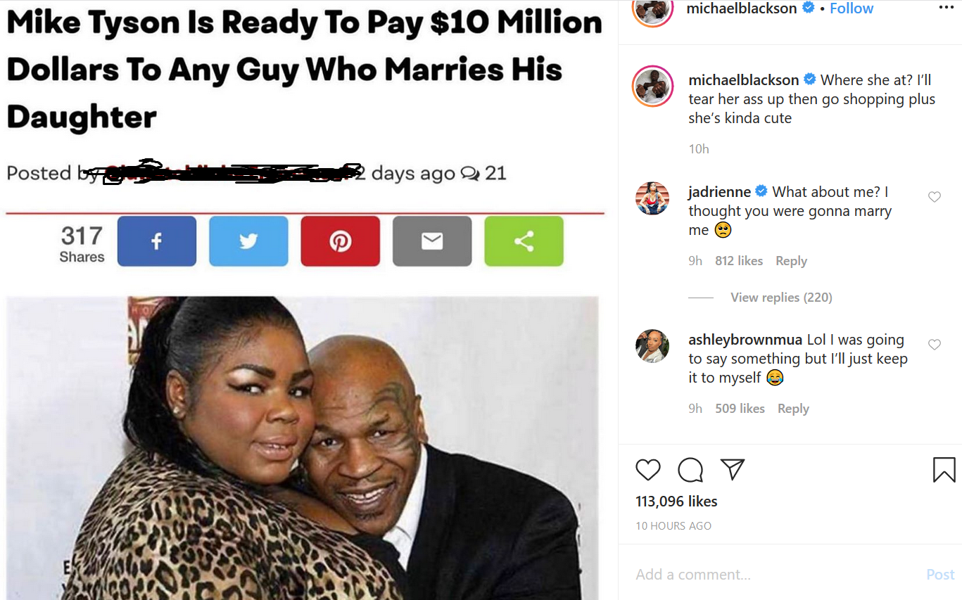 He shared a screenshot of the news report and indicated interest in marrying Mitchell Tyson. Blackson wrote: "Where she at? I'll tear her a** up then go shopping plus she's kinda cute."