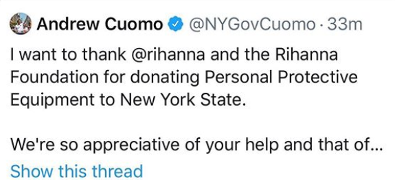 Rihanna donates Personal Protective Equipment to New York to aid in the fight against coronavirus