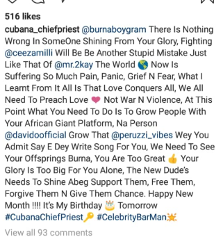 Ceeza Milli reacted to Burna's denial by stating that he "vibed about 50 to 60 percent" of the song (read here). He added: "I had heard the beat by Kel P and vibed the into of the song on my phone." He continued: "We went through the process and recorded the song. Without a doubt, Burna changed some words in the vibes I laid out for him... A song that you vibed about 50 to 60 percent of, will you be wrong to express that you wrote it?" Well, Cubana waded into the drama by warning Burna to back out of fighting Ceeza. Cubana wrote: @burnaboygram There Is Nothing Wrong In SomeOne Shining From Your Glory, Fighting @ceezamilli Will Be Be Another Stupid Mistake Just Like That Of @mr.2kay Which Caused You So Much Stress, The World Now Is Suffering So Much Pain, Panic, Grief N Fear, What I Learnt From It All Is That Love Conquers All, We All Need To Preach Love Not War N Violence, At This Point What You Need To Do Is To Grow People With Your African Giant Platform, Na Person @davidoofficial Grow That @peruzzi_vibes Wey You Admit Say E Dey Write Song For You, We Need To See Your Offsprings Burna, You Are Too Great Your Glory Is Too Big For You Alone, These New Dude’s Needs To Shine, Abeg Support Them, Free Them, Forgive Them N Give Them Chance. Happy New Month