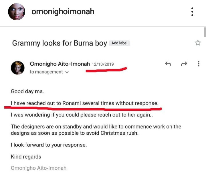 Fashion illustrator, Omonigho Imonah has accused Burna Boy's team of using her designs for Buna Boy in one of his music videos without acknowledging or giving her credit and she shared "receipts" to back her claim. She claims she reached out to Burna's mother last year and sent her 3 Grammy looks she came up with for Burna. She also suggested a fashion designer who would bring her designs to life. She said Burna's mother, Bose Ogulu directed her to Burna's sister who is a stylist, Ronami Ogulu but Ronami ignored her. She said she thought that was the end of it and they had no interest in her illustration for Burna, only for her to see one of the designs had been created for use in one of Burna's music videos. She claimed the jewellery Burna wore in the music video is also her design. She called them out for allegedly using her design after ignoring her. She also called them out for not acknowledging or giving her credit. See below.